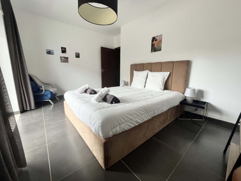Bedroom on the ground floor with large bed and integrated bathroom with a spacious terrace. The room is equipped with built-in cupboards.